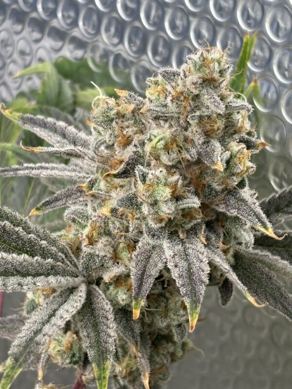 Grape Mountain, bred by Bloom Seed Co., is a powerhouse hybrid born from the cross of MTN Trop and (Grape Pie x Wedding Crasher). This strain doesn’t just bring the fire—it delivers a smooth, creamy aroma with a doughy flavor profile, like that first hit of coffee creamer blending into a strong brew. The buds? Big, bold, and dripping with purple hues, flexing their quality before you even take a rip. Expect an uplifting, happy high that keeps the good vibes rolling—perfect for kicking back with the crew or lighting up any social scene.