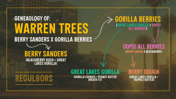 Warren Trees is a straight-up heavy hitter with championship pedigree. Born from the beastly Berry Sanders and turbocharged Gorilla Berries, this one runs hard with a punch of sweet diesel, dark berries, and funked-out forest floor. The inhale slaps, the exhale mellows—it’s built for the finish line.