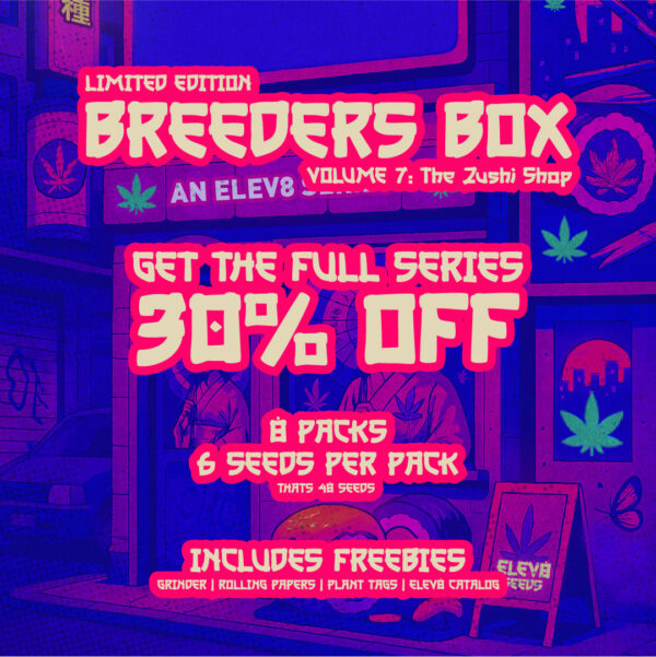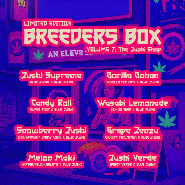 Elev8 Seeds proudly presents the Zushi Shop Breeders Box, a Croptober-only release featuring every strain from our Zushi Shop Series — built on the legendary Blue Zushi lineage. This is your chance to collect and grow all 8 Blue Zushi crosses in one box, now available at 30% off retail with exclusive freebies included.